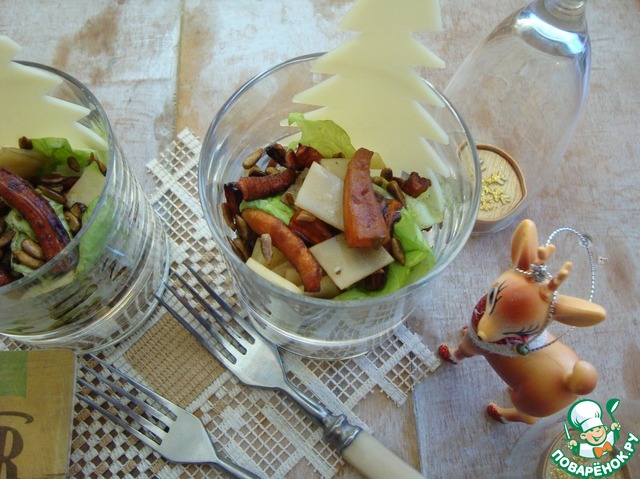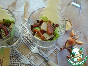 Для подачи я взяла стаканы для виски. Вырезала ёлочки 2 шт из 1 куска сыра для красоты и новогоднего настроения. Разложила салат порционно и украсила ёлочками.