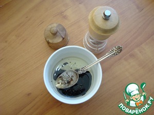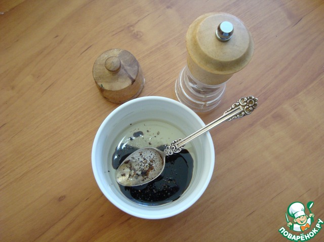 Делаем заправку для салата. Масло оливковое соединяем с бальзамиком солим и перчим свжемолотым чёрным перцем по вкусу.