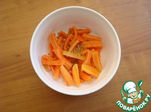 Морковь чистим, моем, обсушиваем и режем брусочками не совсем мелкими. Выкладываем в морковь сахар и перемешиваем.