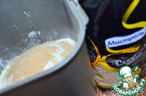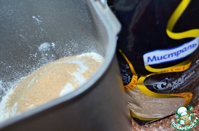• Замесить тесто. Я это доверяю своей помощнице - хлебопечке. Согласно инструкции, вначале заложить жидкие продукты, затем сухие. Т. е. влить теплую сыворотку, засыпать оба вида просеянной муки, сахар. Я использую тростниковый сахар Демерара от ТМ Мистраль.