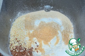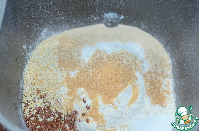 • Затем всыпать семена льна и жареный кунжут, соль, дрожжи.