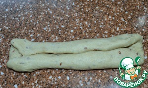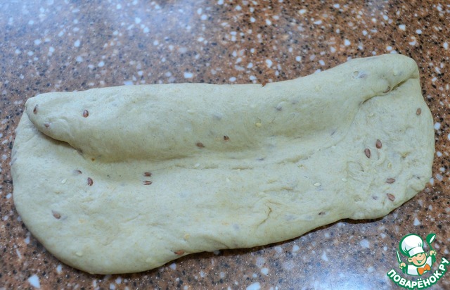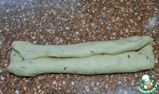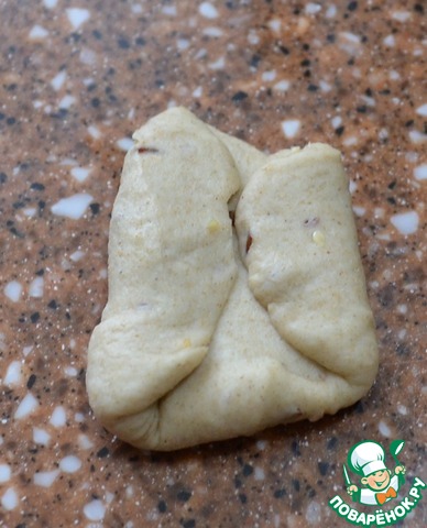 Из двух сформовать колос. Для этого тесто расплющить в прямоугольник, верх подвернуть вовнутрь и защепить.