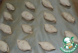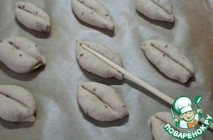 • Палочкой промять посередине. Оставить на расстойку на 15 - 20 минут. Перед самым выпеканием надрезать острым лезвием и смазать сливками.