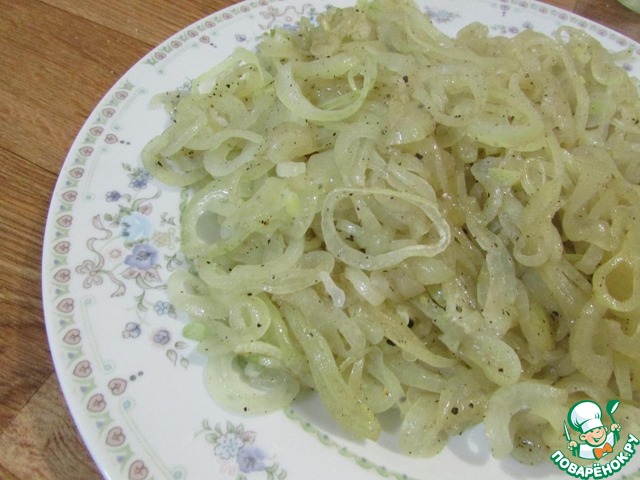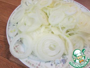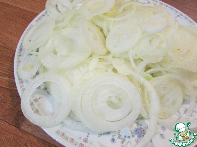 Приготовить начинку. Репчатый лук почистить и нарезать кольцами.