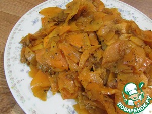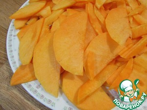 Тыкву освободить от кожуры и семян. Нарезать тонкими слайсами.
