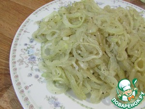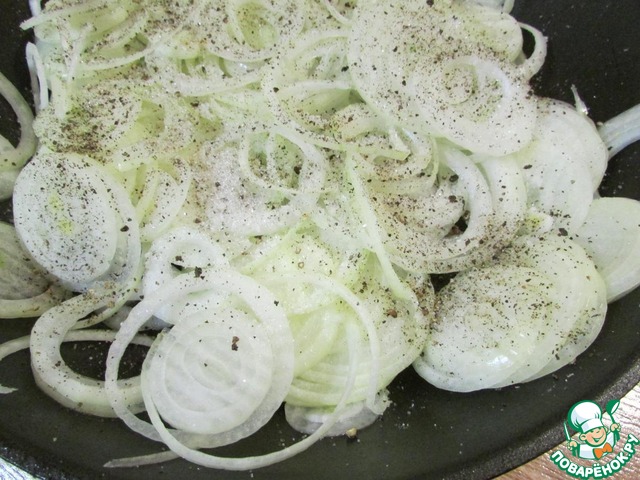 На сковороде разогреть 2 ст. л. растительного масла. Добавить лук. Посолить, поперчить, добавить щепотку сахара. Тушить на слабом огне, примерно 10 минут.