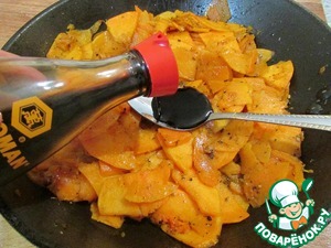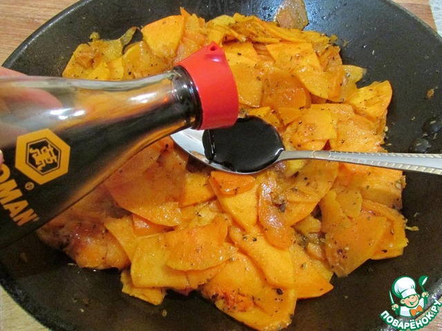 Влить соевый соус. Обжарить тыкву, около 5 минут.