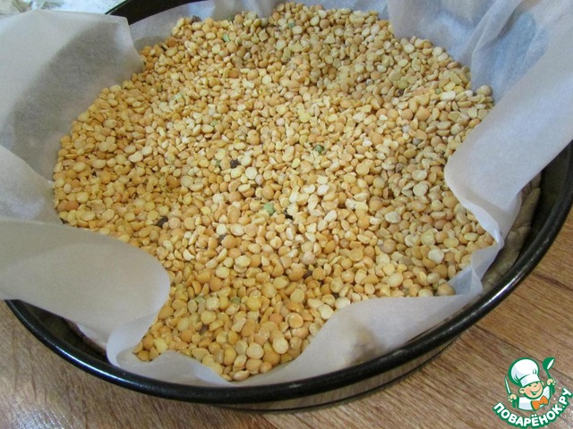 Тесто накрыть пергаментом, поверх высыпать горох и отправить форму в холодильник. Эти временем разогреть духовку до 180 градусов. Поставить форму с тестом и выпекать 15 минут, затем снять пергамент с горохом и печь еще 10 минут.