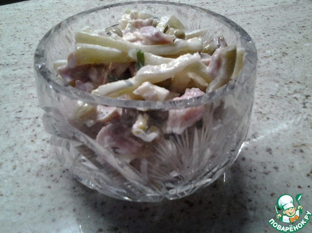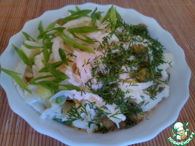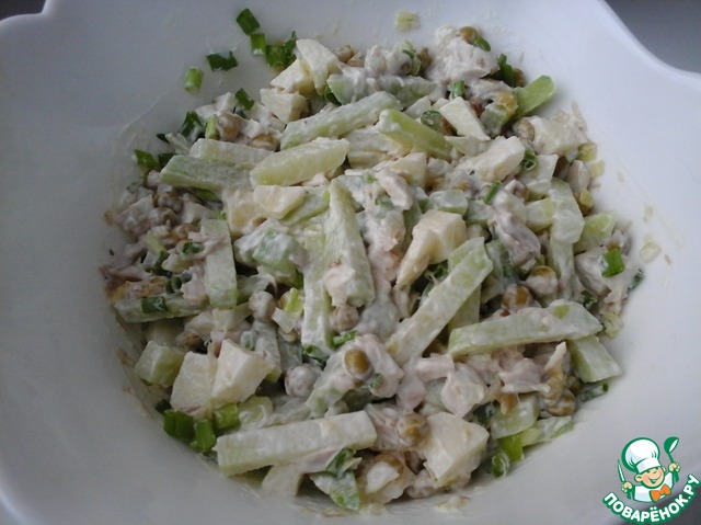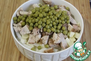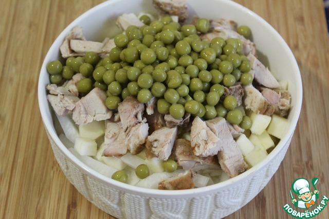 • Добавить к салату зеленый горошек, лук, посолить и поперчить по вкусу.