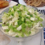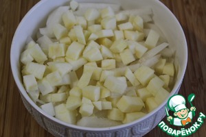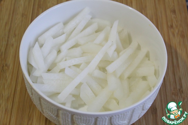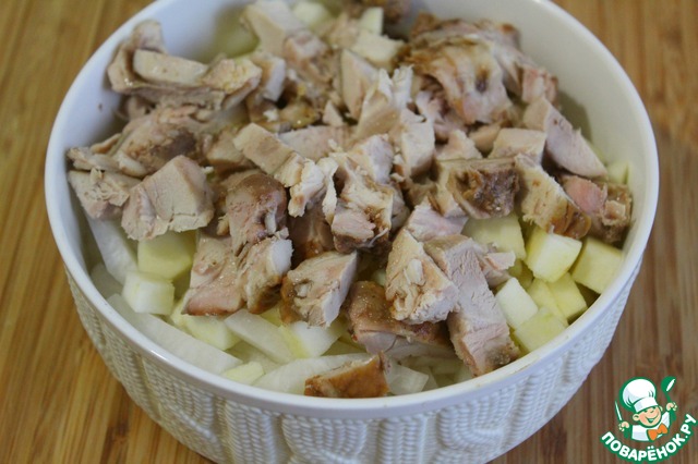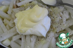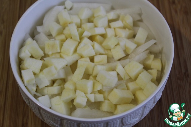 • Яблоко очистить и порезать кубиком. Добавить к дайкону.