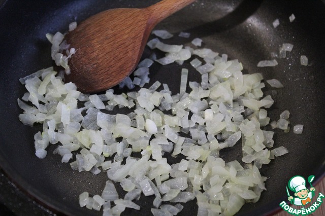 Лук порезать кубиком и притушить слегка на разогретой сковороде с растительным маслом - лук не меняет цвет и остается чуть хрустящим. Остудить.