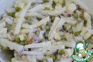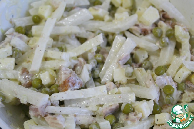 Очень люблю этот салат и готовлю часто, но без горошка. С ним оказалось тоже вкусно и нежно, не смотря на то, что брала зеленую редьку. Яблоко ( от кожуры не очищала) и редьку натерла на терке для корейской моркови , за счет тонкой нарезки редька не горчила и была очень сочной, поэтому я ее не промывала, не отжимала. Вкусно! Что тут еще скажешь?