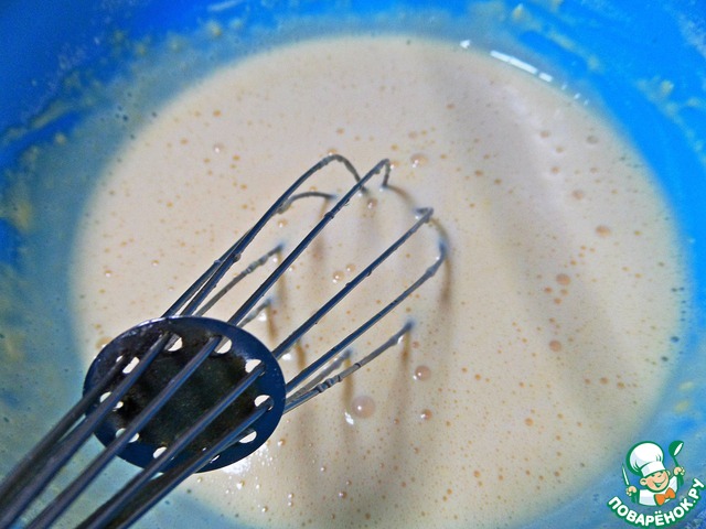 Подливаем молоко-200 мл и взбиваем массу венчиком. Вверху я указала 50 мл молока для яиц, но порошок требует большего количества жидкости. Подливая постепенно, мы видим, сколько его нужно.