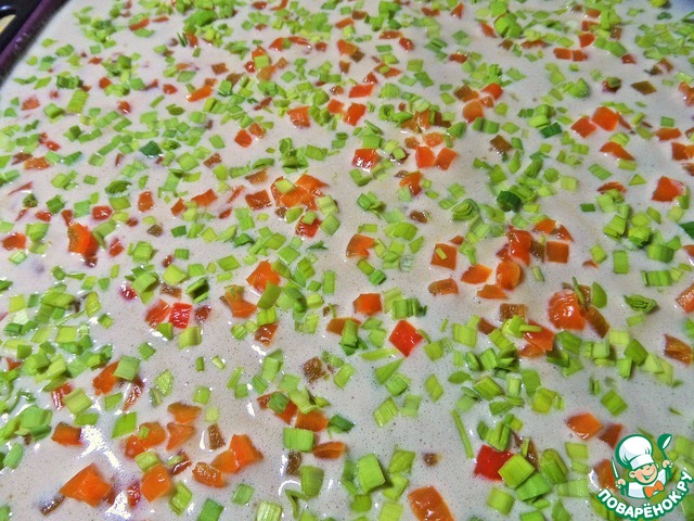 Теперь посыпаем подготовленными добавками-кубиками перца. Автор советовала взбивать омлет сразу с добавками, но мне показалось так будет равномернее.