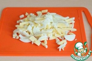 Консервированный ананас (кольца) порезать мелкими кубиками.