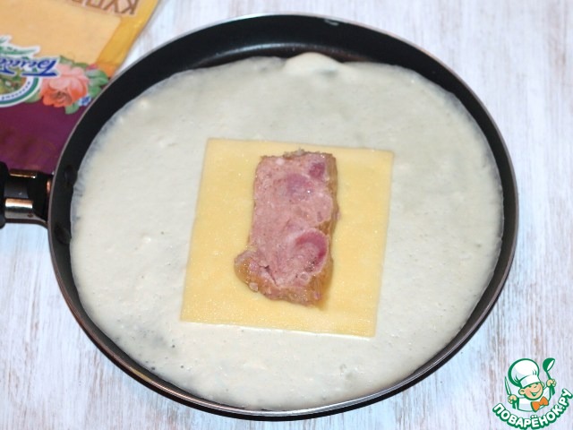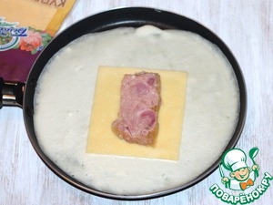 Когда тесто "схватится", кладем на середину блина одну пластину сыра и 1 кусочек ветчины.