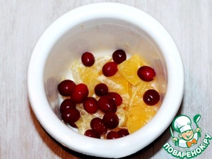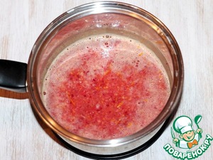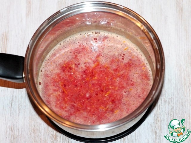6. В небольшую кастрюлю налить 1 стакан воды, добавить 1 ст. ложку цедры апельсина, 1 ст. л. сахара, фруктовое пюре, перец душистый, щепотку розмарина, и прогреть на слабом огне в течение 5 минут.