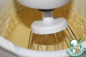 Всыпьте частями муку в масляную смесь, хорошо перемешайте. Форму смажьте сливочным маслом и выложите в неё тесто.