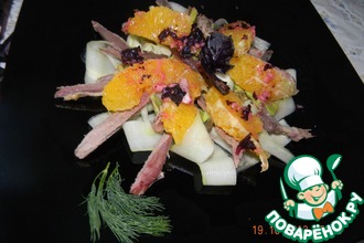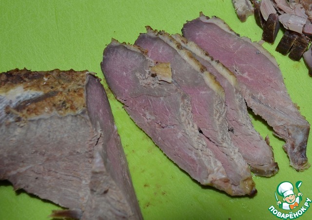 Заранее запечь утиную грудку, или у Вас осталось от праздников. Грудку нарезать мелким кубиком. Выложить в салатник.