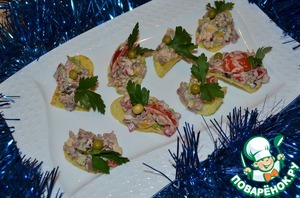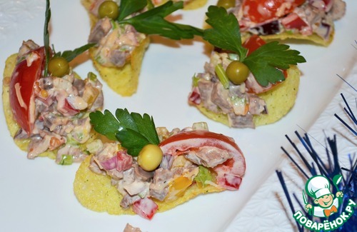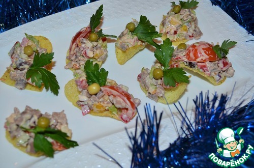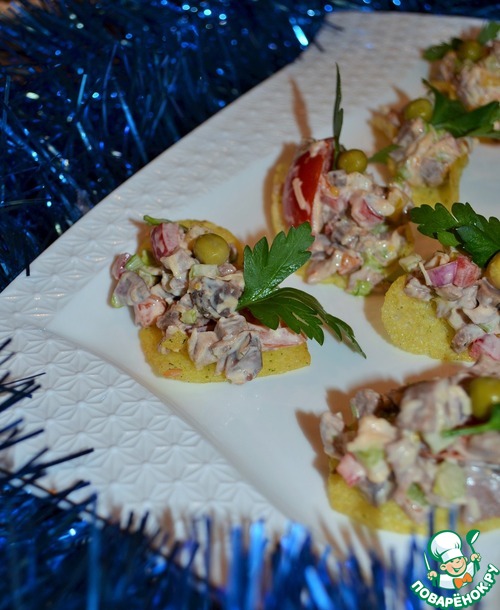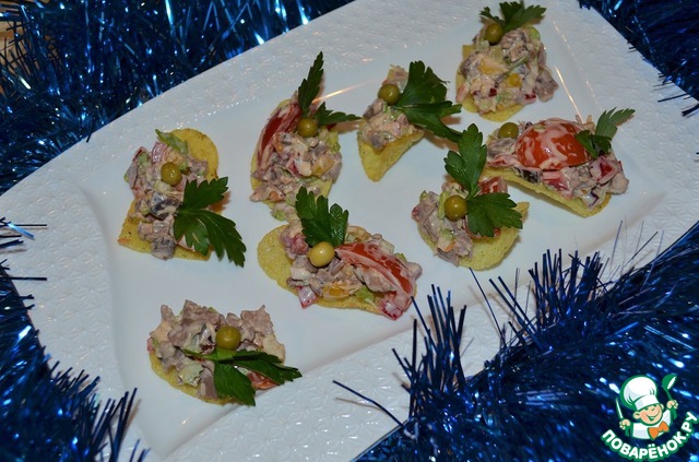 Но на праздничный стол подадим его на чипсах, украсив зеленым горошком и зеленью петрушки.