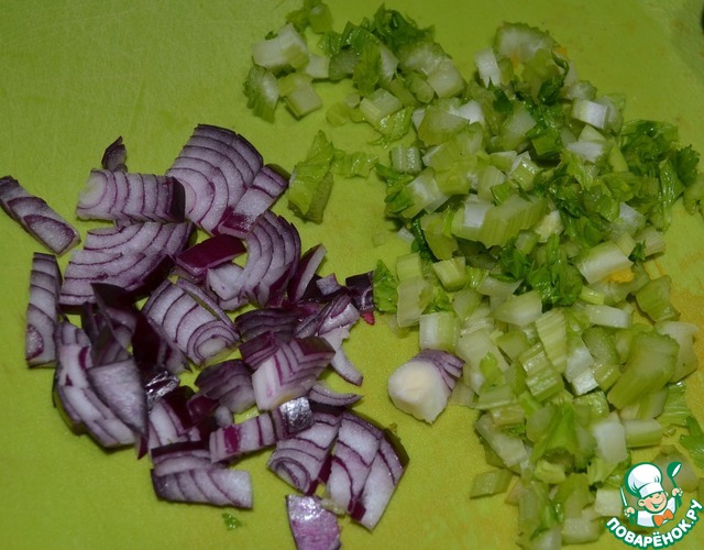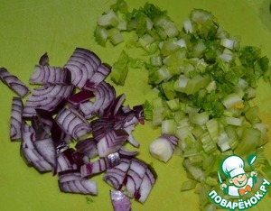 Таким же размером нарезать сельдерей и красный лук. Выложить в салатник.