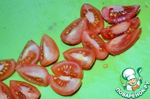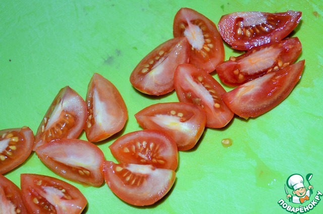 Черри вымыть, обсушить и нарезать четвертинками. Выложить в салатник.
