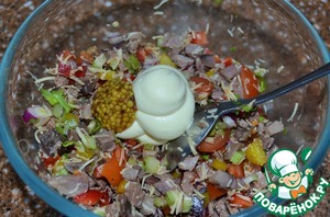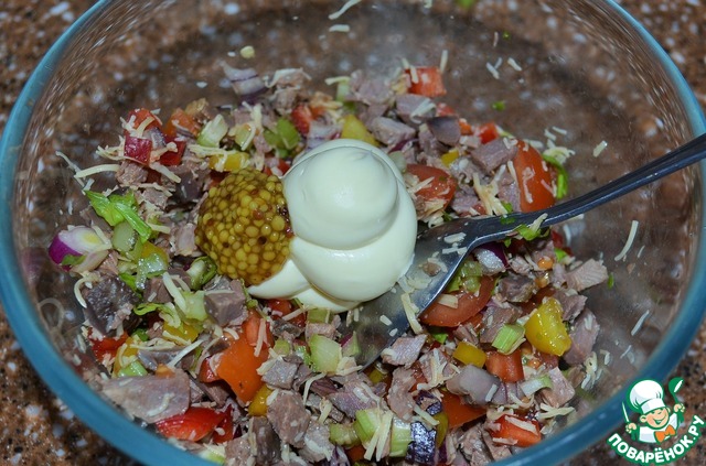 Добавить майонез и горчицу. Перемешать.