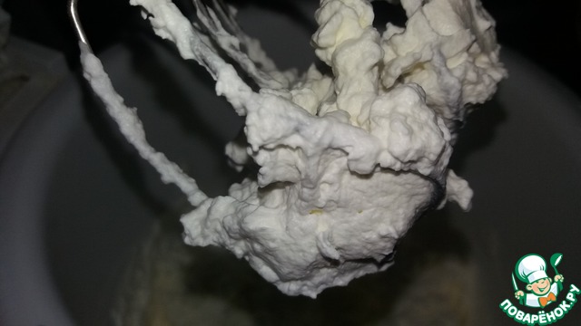 Сливки взбить до густых пиков с сахарной пудрой и ванилином.