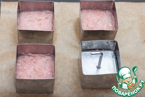 Итак, фарш разделить на 9-10 частей, заполнить кольца, утрамбовать. -