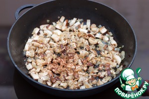 Грибы (у меня белые) и лук мелко нарезать, обжарить на масле до готовности, посолить, поперчить, всыпать щепотку мускатного ореха.