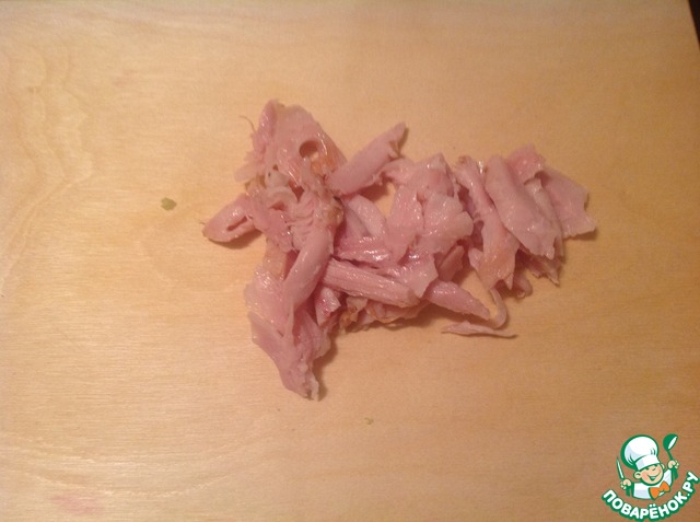 • Копченую или вареную курицу освобождаем от кожи и режем ломтиками. Выкладываем в хаотичном порядке. Для совсем облегчённого варианта, этот шаг можно пропустить.