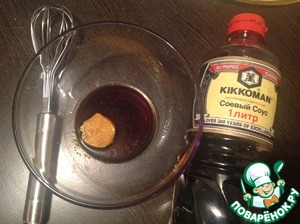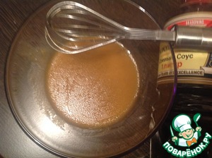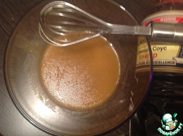 • Приготовим для нашего салата заправку. В миску вливаем рисовый уксус, оливковое масло, соевый соус ТМ Киккоман, дижонскую горчицу, сахар.