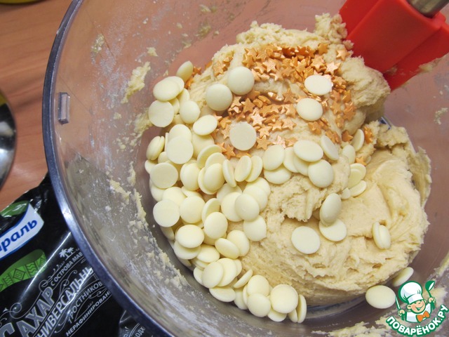 Добавить белый шоколад. Я также добавляю в тесто немного кондитерской посыпки. А потом украшаю посыпкой и сверху.