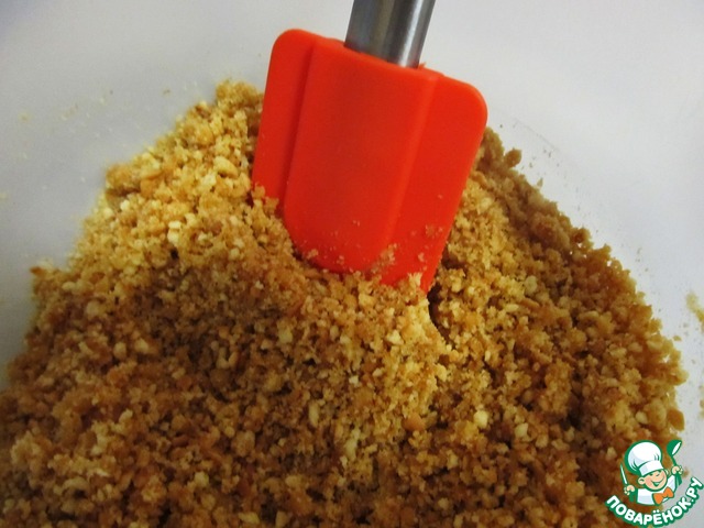 Конечно, идеальна будет крошка от имбирного печенья, но можно и в обычную просто добавить специи по вкусу. Смешать крошку с растопленным сливочным маслом. Разложить по креманкам или выложить дно 20-сантиметровой разъемной формы (обычную форму нужно выложить пекарской бумагой, но у меня разъемные силиконовые борта, поэтому это действие не требуется). Утрамбовать и убрать в холодильник.