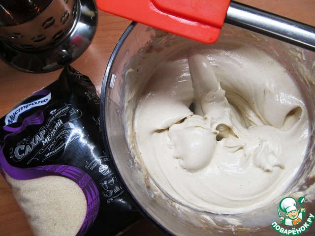 Смешать сыр, сгущенку, сахар и специи. Сахар необходим мелкий, чтобы без проблем растворился в креме. Выложить сверху на печенье готовый крем. Убрать креманки или форму в холод, желательно минимум на пару часов, чтобы крем получше застыл.