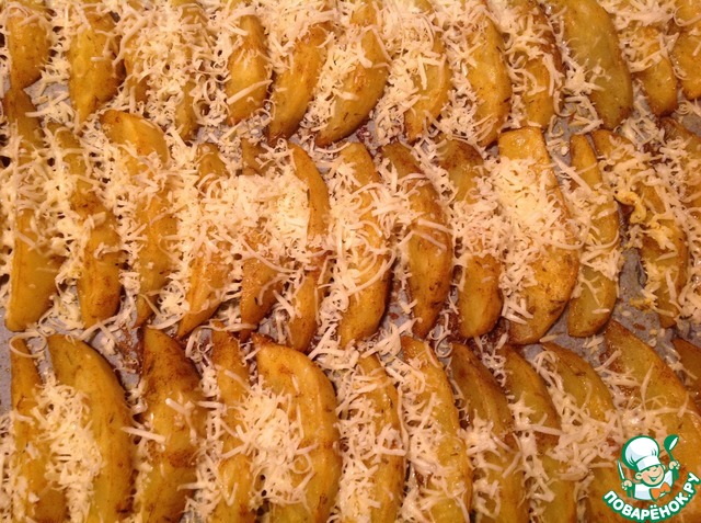 Через 15-20 минут после начала запекания картофель вынуть из духовки и посыпать сыром. Поместить обратно в духовку.