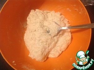 В муку влить жидкие ингредиенты и перемешать. Если тесто получилось жидкое, добавить ещё муки.