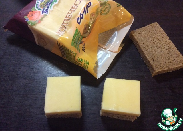 С ломтика хлеба срезать корочку. На кусочек хлеба уложить кусочек сыра, подравнять по размеру ломтика и разрезать каждый ломтик хлеба на 4 части.