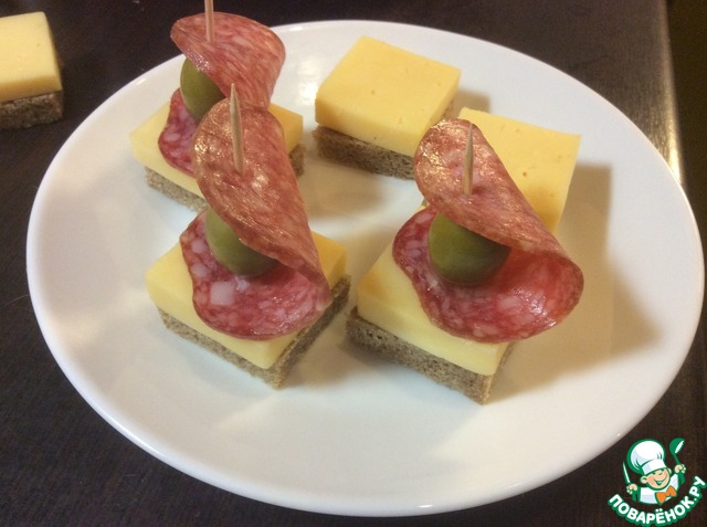 Проткнуть кусочек колбаски у края, нанизать оливку и проткнуть противоположным край салями. Вставить зубочистку в центр кусочка сыра с хлебом.