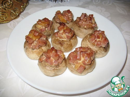 • Наполнить шампиньоны ветчинной смесью и отправить в предварительно разогретую до 200°С духовку на 15 минут.