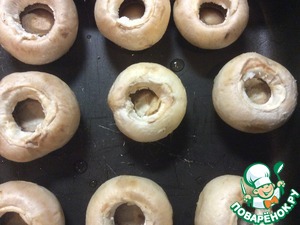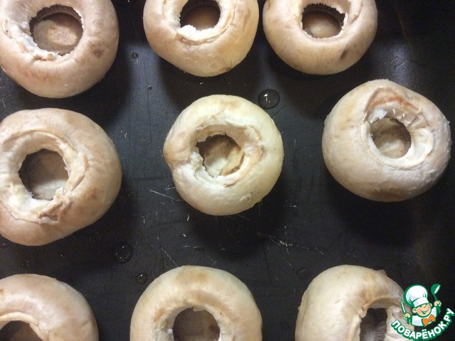 Шампиньоны вымыть, удалить ножку и выложить на противень.