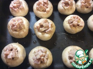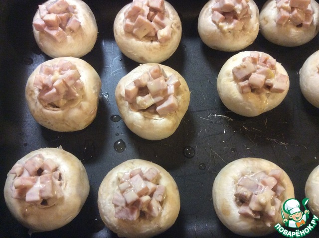 Наполнить шампиньоны ветчинной смесью и отправить в предварительно разогретую до 200°С духовку на 15 минут.