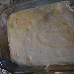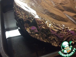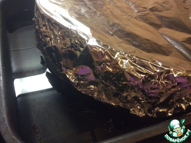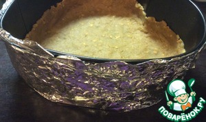 Выливаем нашу смесь в форму с печеньем. Сверху форму накрываем фольгой.