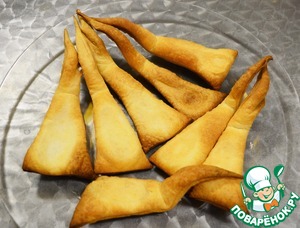 Тесто раскатываем в тонкий пласт и нарезаем его вот такими острыми треугольниками.