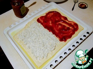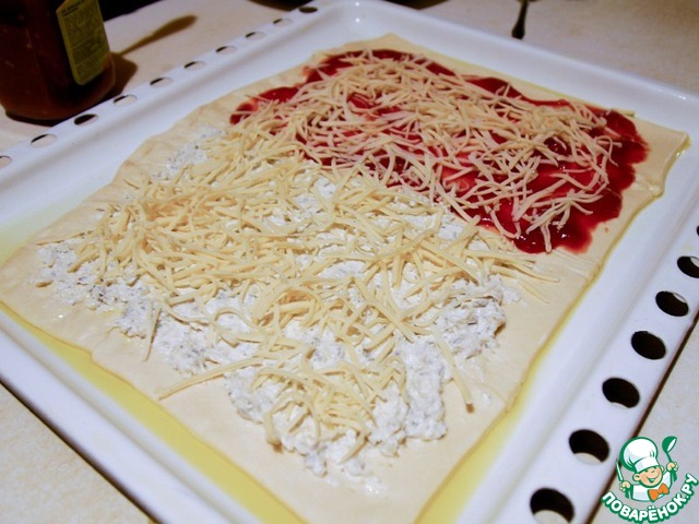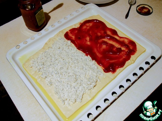 Смазываем противень маслом. Выкладываем тесто и смазываем нашими соусами - томатным и бешамель.