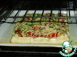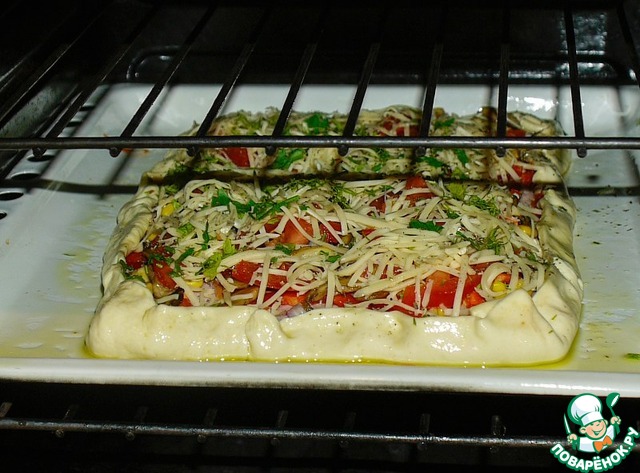 Второй раз посыпаем сыром и зеленью. Отправляем в максимально разогретую духовку. Огонь убавляем до "среднего-ниже среднего".
