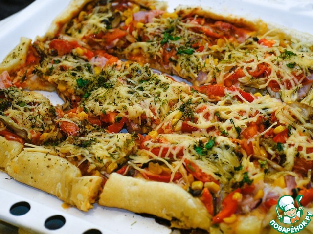 Наслаждаемся сытной сочной ароматной пиццой. Подавать горячей!