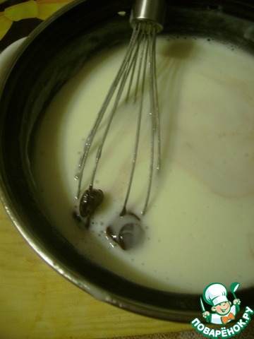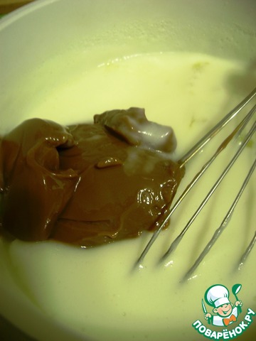 В одну половину всыпать измельченный темный шоколад и размешивать до полного растворения. -