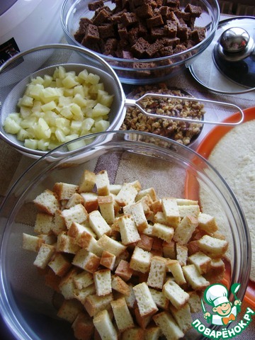 Оставшиеся коржи нарезать небольшими кубиками. -