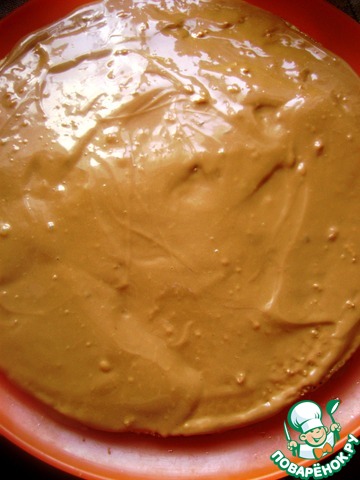 Смазать нижнюю половину коржа щедрым слоем крема с вареной сгущенкой. Накрыть второй половиной и чуть прижать минут на десять.